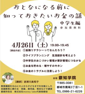 都城市にある個別指導塾の叡智学院で小学生向け、高校生向けにお金の講座を開催しました。